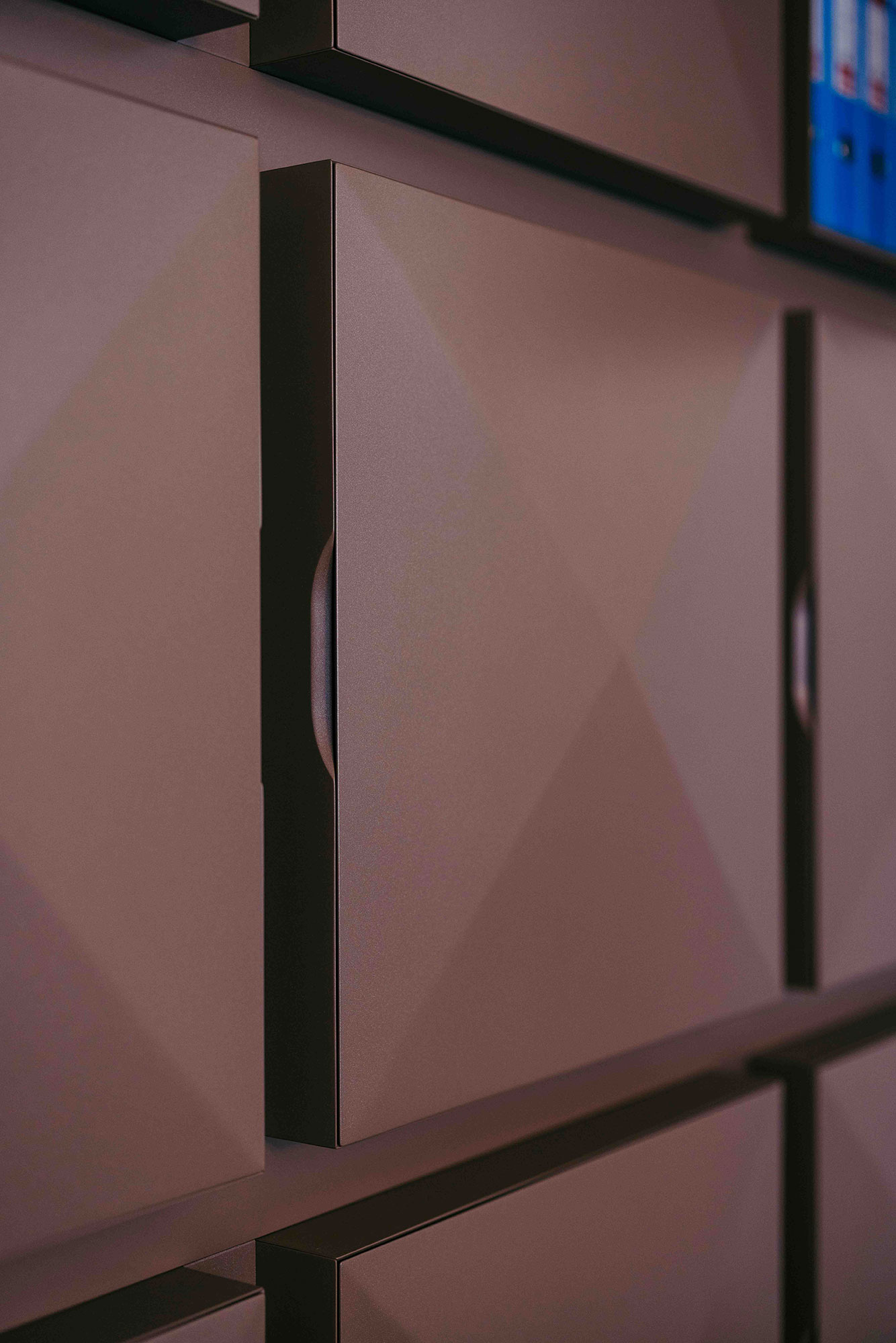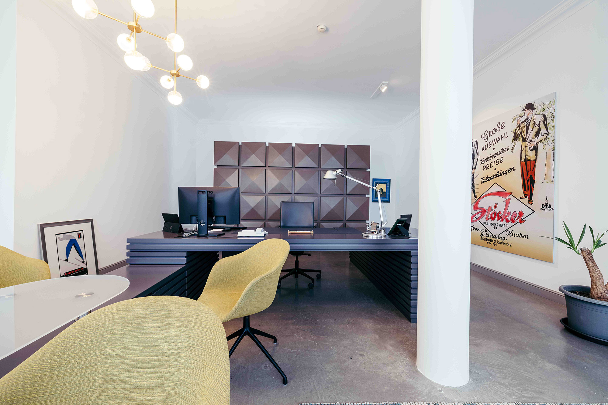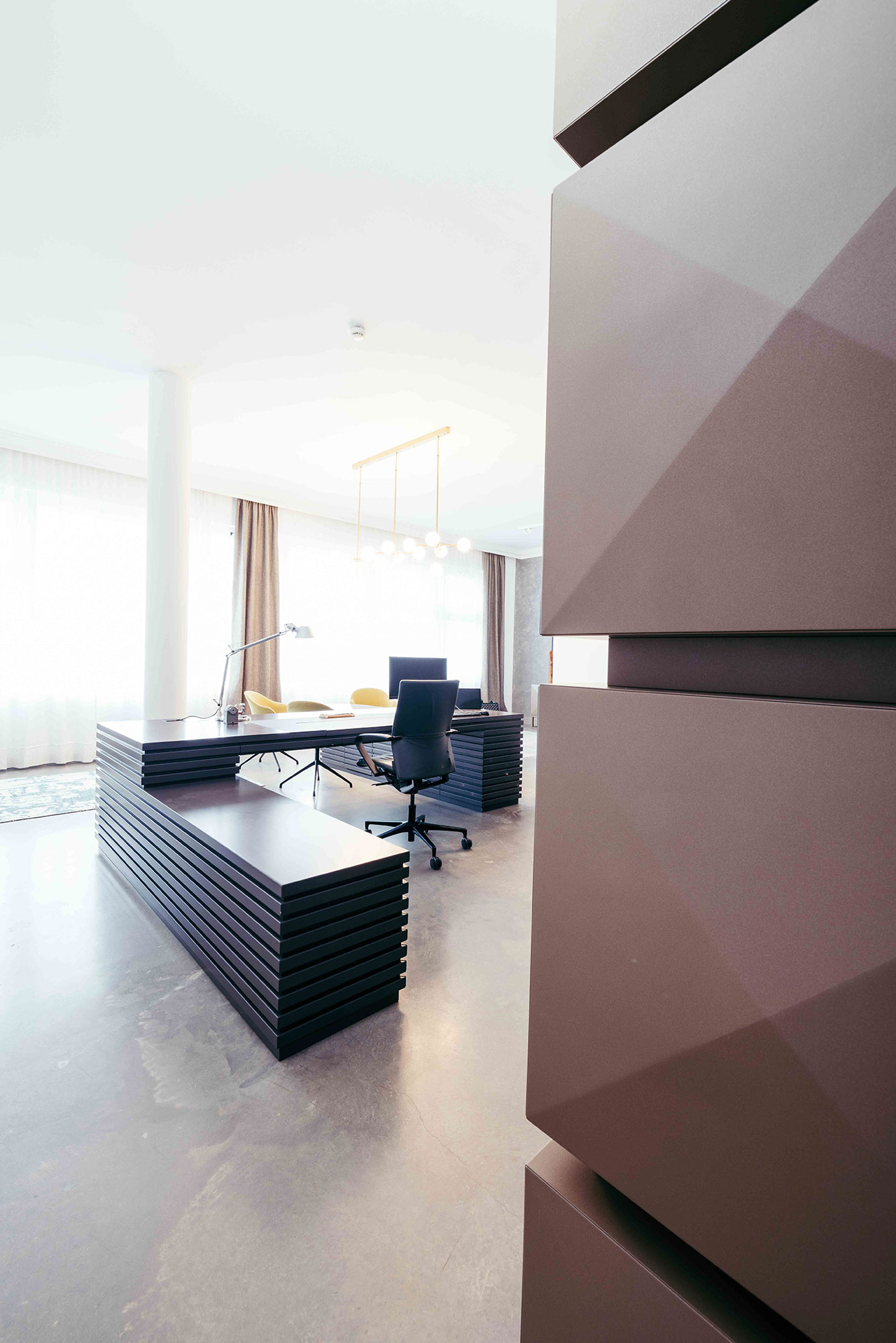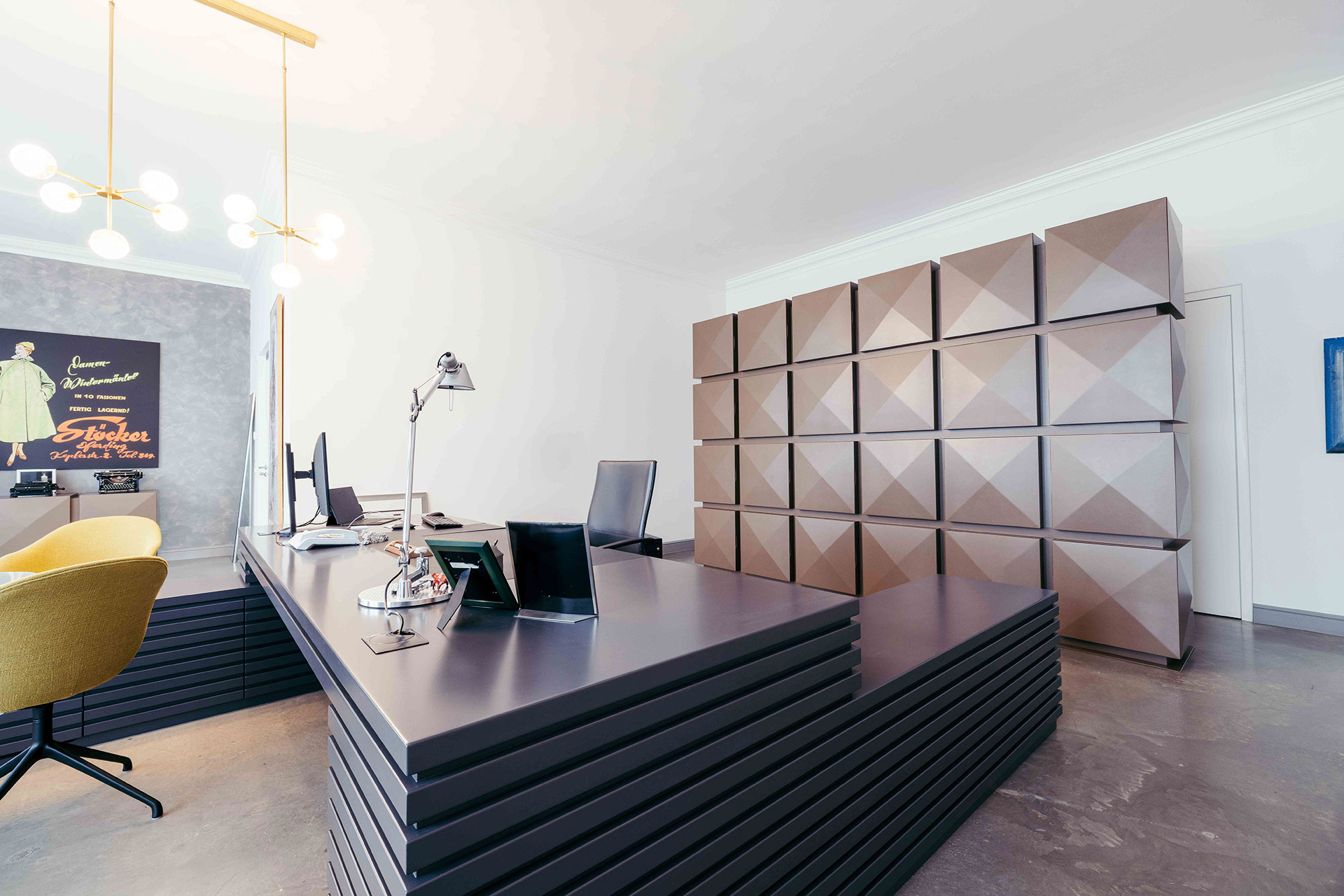 Affinität zu Architektur zeichnet den Chef des Modehauses aus und so wurde sein Einrichtungswunsch mit einer gewissen Extravaganz umgesetzt. Dieses schöne Projekt war auch für unsere Tischler-Facharbeiter eine Gelegenheit, das erlernte Handwerk im Detail unter Beweis zu stellen. Der Raumteilerschrank als getarnter Aktenschrank ist optisch ein Highlight durch seine 3D-Pyramidenfronten und darüber hinaus beidseitig bedienbar. Die Oberfläche bildet ein spezieller Lack mit Metalleffekt. Die Schreibtisch-Besprechungstisch-Kombination verfolgt im Gegensatz eine lineare Optik und ist in einem gegensätzlichen Uni-Lackfarbton gestaltet, passend zum Boden aus geschliffenem Fliesenstrich.