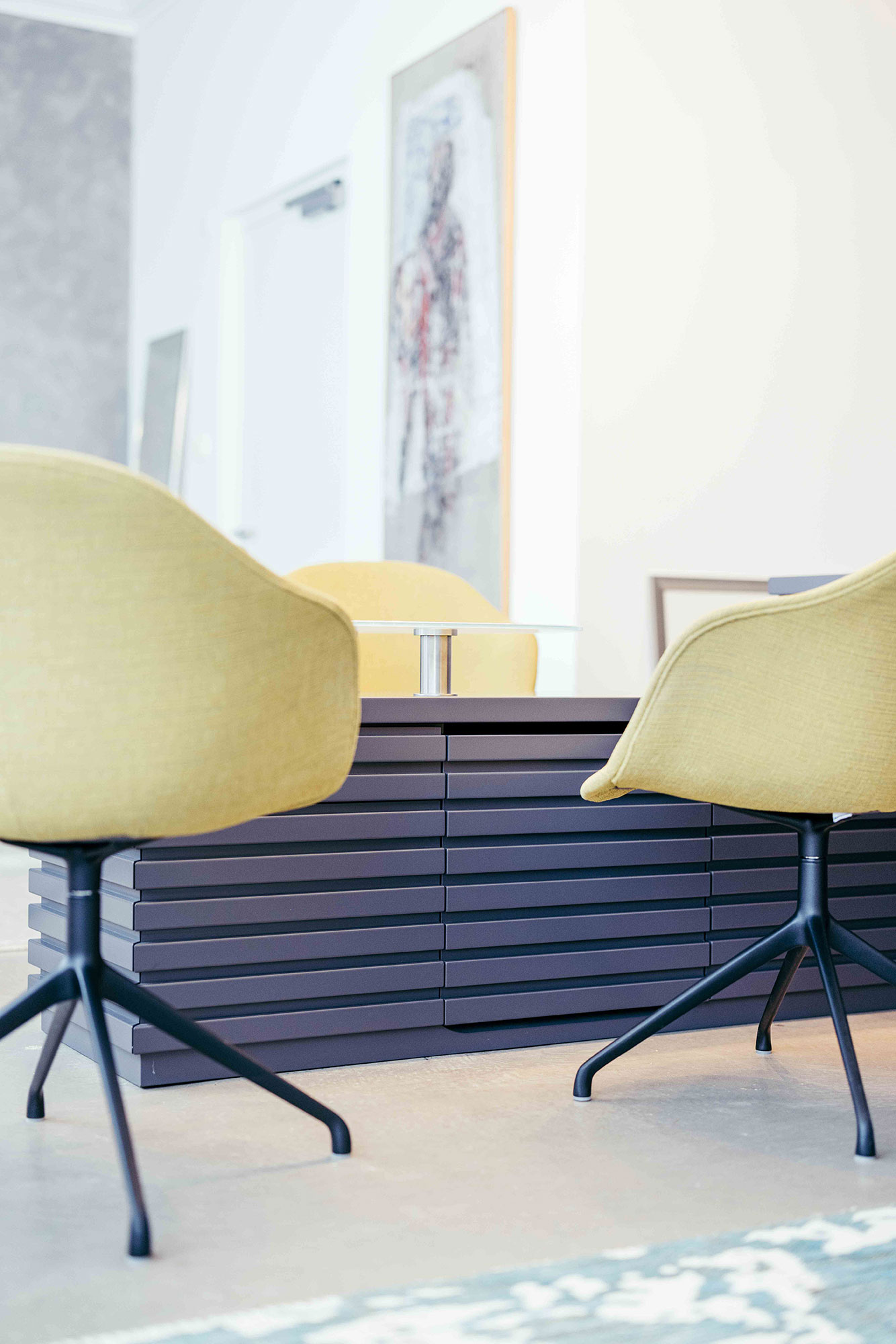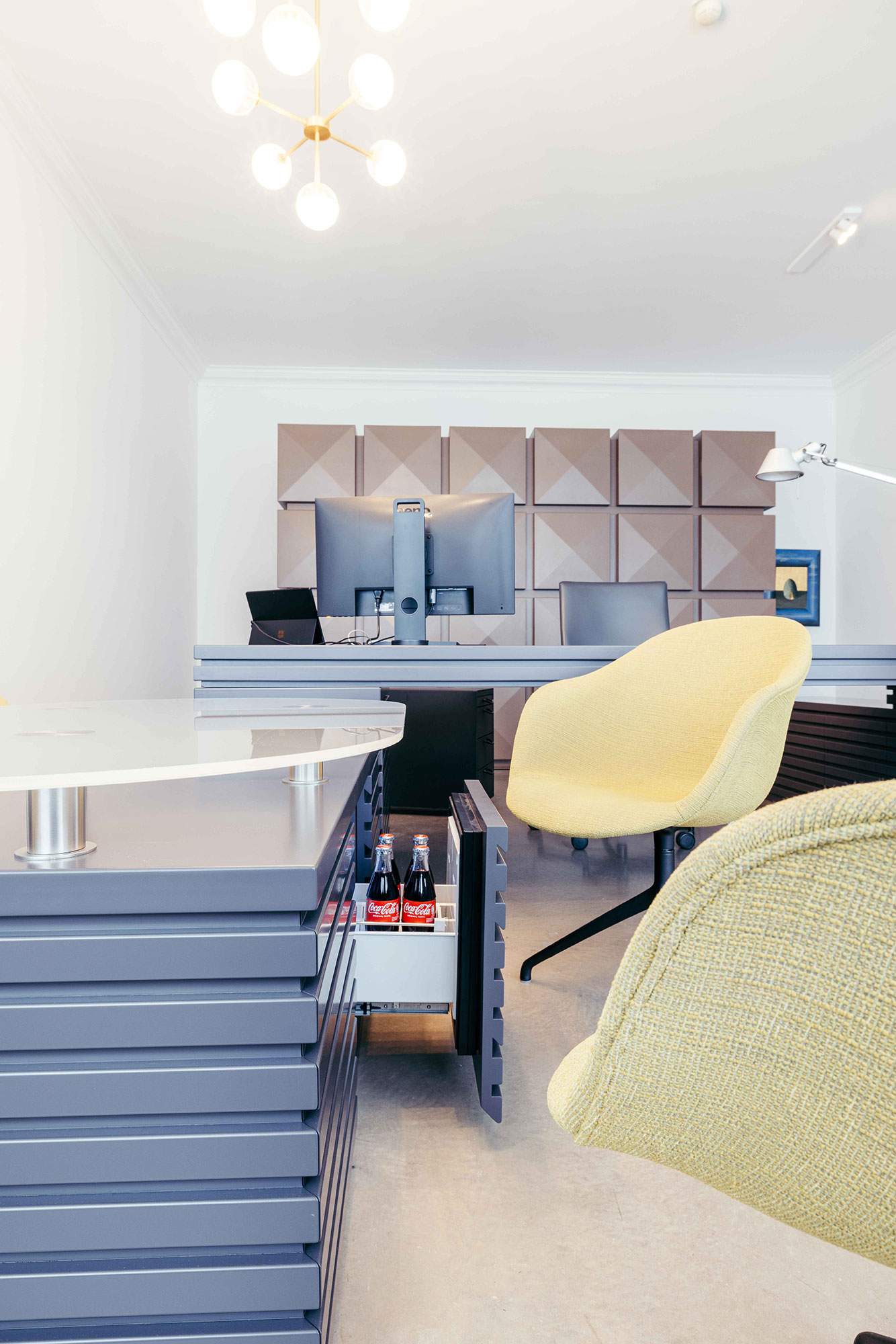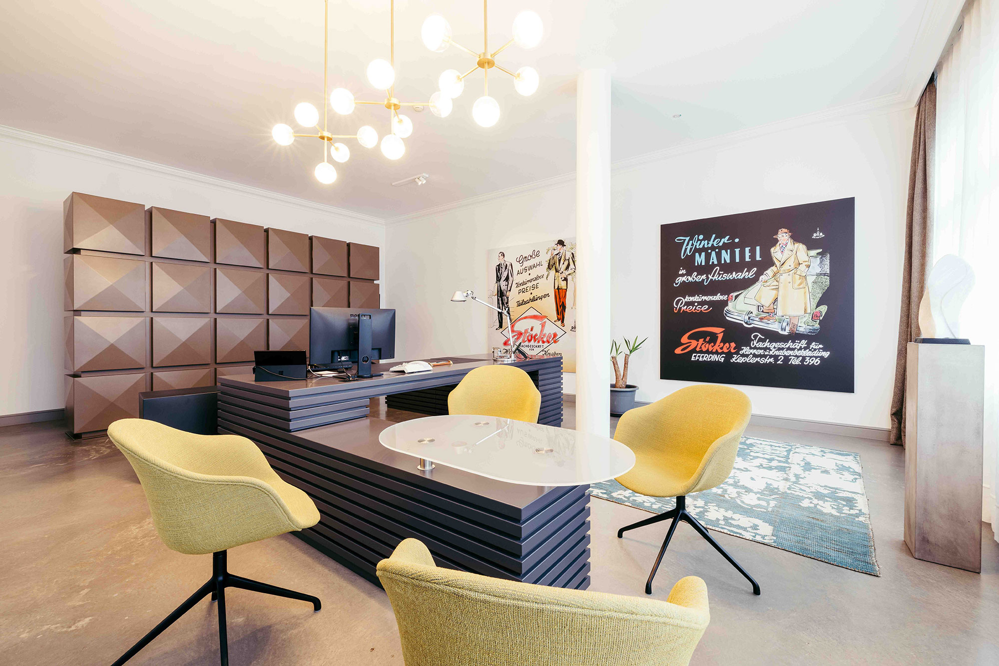 Affinität zu Architektur zeichnet den Chef des Modehauses aus und so wurde sein Einrichtungswunsch mit einer gewissen Extravaganz umgesetzt. Dieses schöne Projekt war auch für unsere Tischler-Facharbeiter eine Gelegenheit, das erlernte Handwerk im Detail unter Beweis zu stellen. Der Raumteilerschrank als getarnter Aktenschrank ist optisch ein Highlight durch seine 3D-Pyramidenfronten und darüber hinaus beidseitig bedienbar. Die Oberfläche bildet ein spezieller Lack mit Metalleffekt. Die Schreibtisch-Besprechungstisch-Kombination verfolgt im Gegensatz eine lineare Optik und ist in einem gegensätzlichen Uni-Lackfarbton gestaltet, passend zum Boden aus geschliffenem Fliesenstrich.