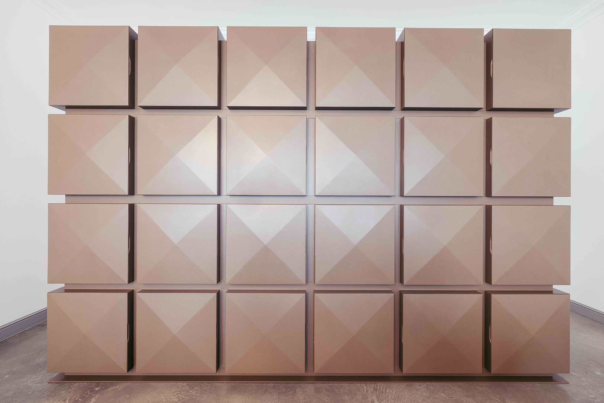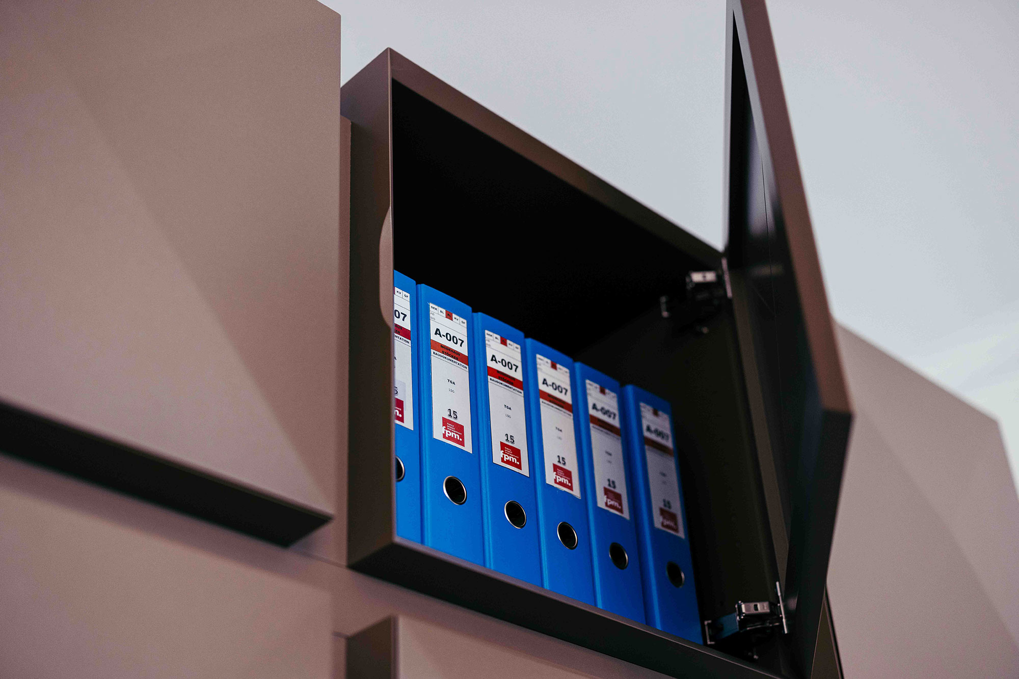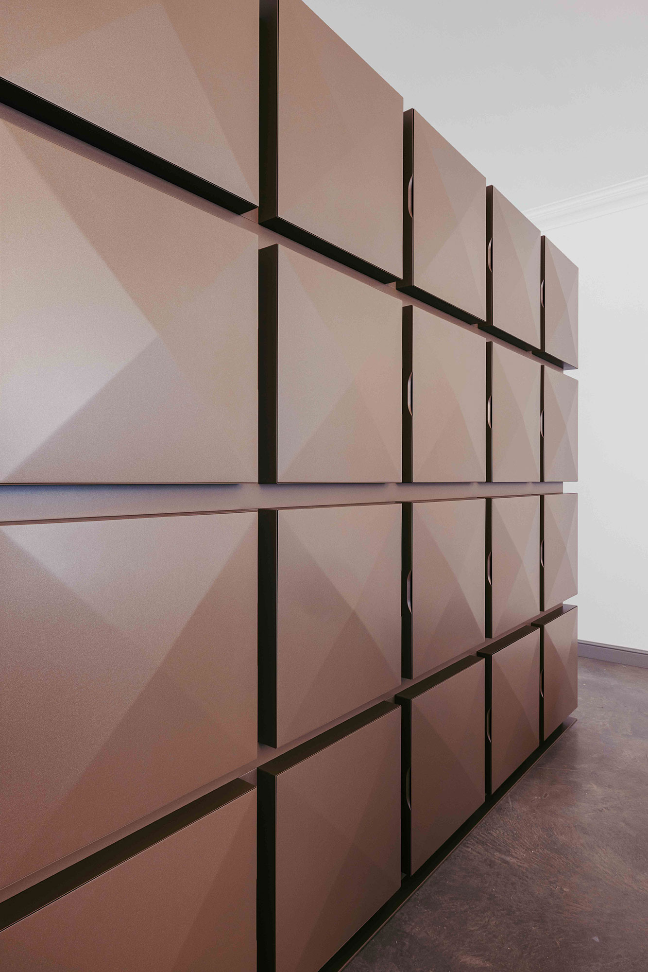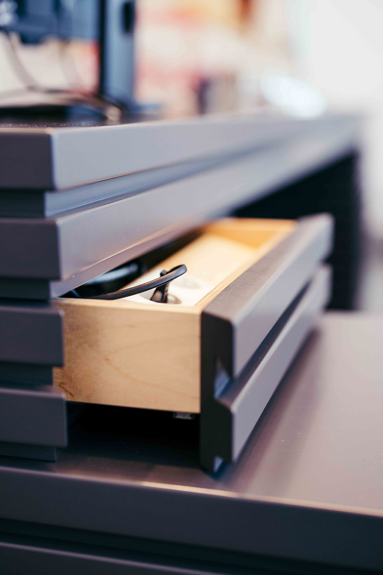 Affinität zu Architektur zeichnet den Chef des Modehauses aus und so wurde sein Einrichtungswunsch mit einer gewissen Extravaganz umgesetzt. Dieses schöne Projekt war auch für unsere Tischler-Facharbeiter eine Gelegenheit, das erlernte Handwerk im Detail unter Beweis zu stellen. Der Raumteilerschrank als getarnter Aktenschrank ist optisch ein Highlight durch seine 3D-Pyramidenfronten und darüber hinaus beidseitig bedienbar. Die Oberfläche bildet ein spezieller Lack mit Metalleffekt. Die Schreibtisch-Besprechungstisch-Kombination verfolgt im Gegensatz eine lineare Optik und ist in einem gegensätzlichen Uni-Lackfarbton gestaltet, passend zum Boden aus geschliffenem Fliesenstrich.