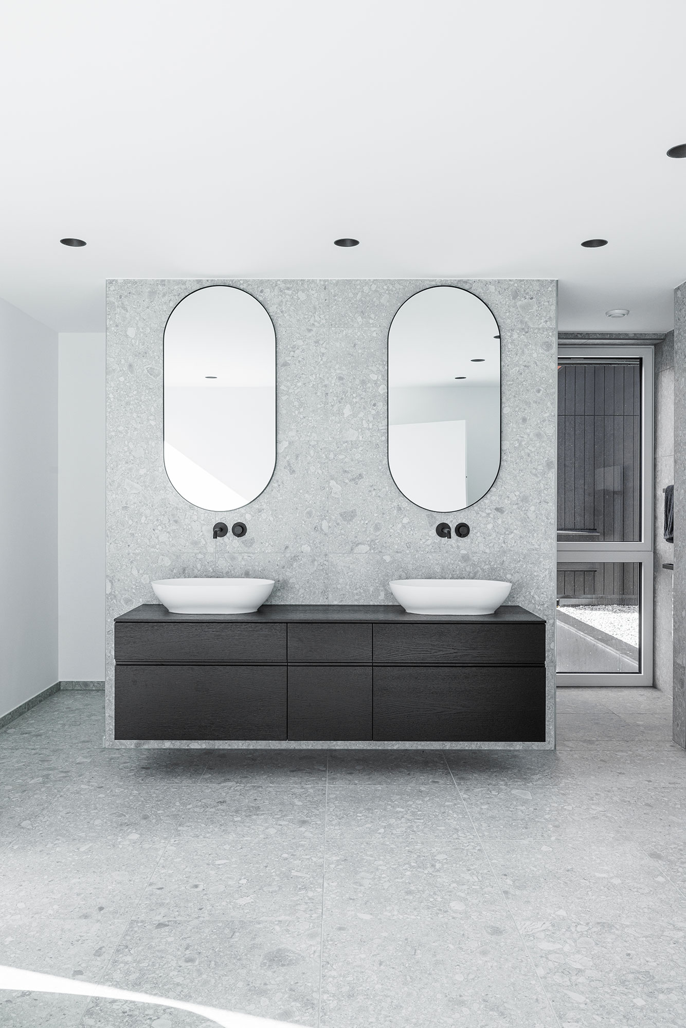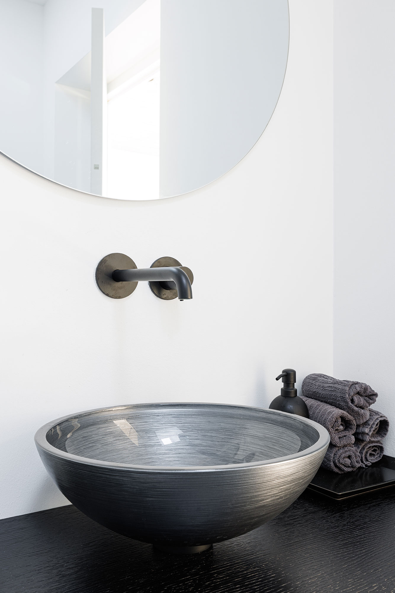 Im großzügigen WC-Raum erfüllt ein moderner Waschtisch aus schwarz-offenporig lackierter Eiche mit Aufsatzwaschschüssel die Wunschfunktion unserer Kunden.